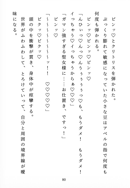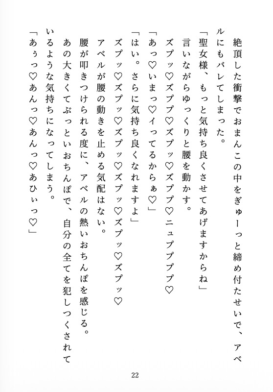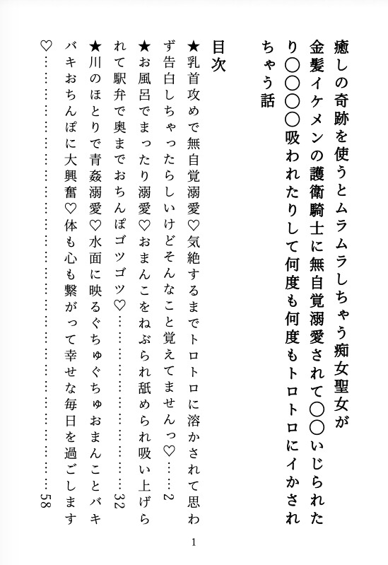 | タイトル | 癒しの奇跡を使うとムラムラしちゃう痴女聖女が金髪イケメンの護衛騎士に無自覚溺愛されて◯◯いじられたり◯◯◯◯吸われたりして何度も何度もトロトロにイかされちゃう話 |