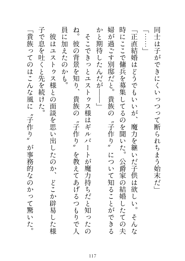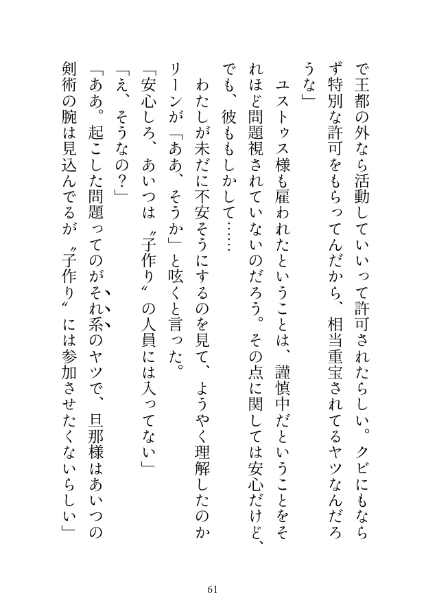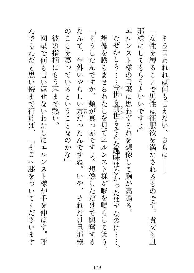 その過程でユストゥスの想いを知り、半月後、ユストゥスとの“子作り”の前に彼の愛を再確認した「わたし」。
