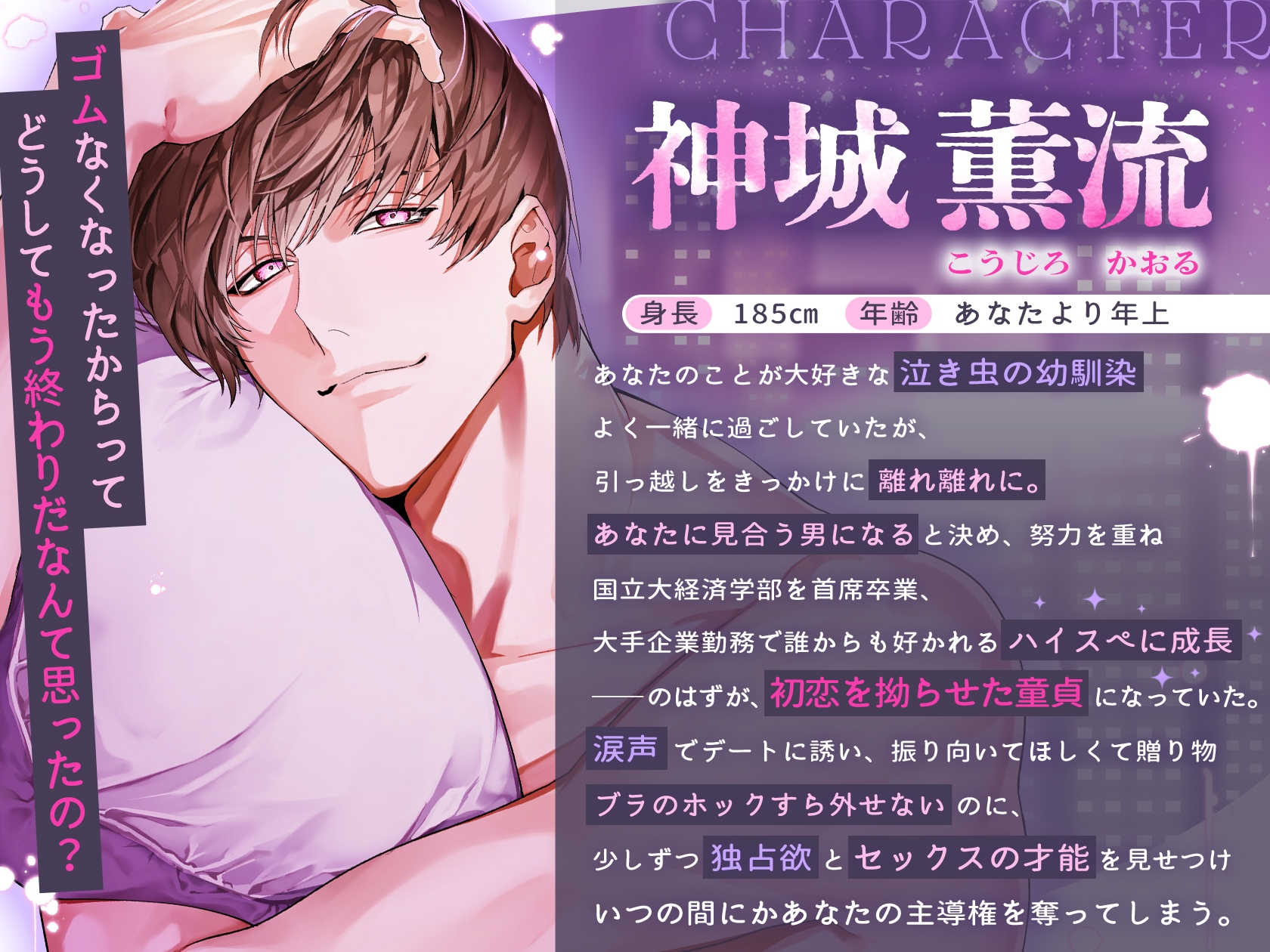 | タイトル | 【※※俺の子種たくさんもらってくれるよね?※※】再会した初恋相手は無自覚Sなハイスぺ童貞 ~ゴム一箱使い切っても収まらない絶倫執着無限射精♡~ |